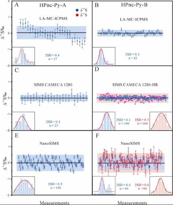 在最关键的同位素均一性验证环节,研究团队组织了国内多平台、多实验室的联合攻关,利用LA-MC-ICP-MS、大半径SIMS(CAMECA IMS 1280-HR)和纳米离子探针(NanoSIMS) 等多种微区分析技术,对合成黄铁矿(HPnc-Py-A和HPnc-Py-B)进行了全面的硫同位素(δ³⁴S和δ³³S)分析(图3)。结果显示: