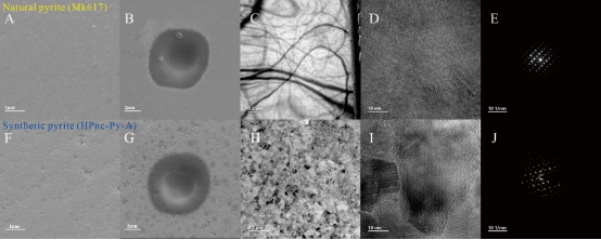 图2 | 天然黄铁矿(A-E)与合成黄铁矿(F-J)的微观结构与溅射行为对比。(A, F)背散射电子图像;(B, G)SIMS分析坑;(C-E, H-J)高分辨透射电镜及选区电子衍射图。可见两者微观结构虽异,但溅射坑形态一致。